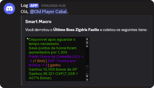 A imagem acima mostra uma mensagem no Discord personalizada pelo usuário e enviada pelo Smart Macro contendo a informação do último boss (Zigdris Faello) da DG Lago do Crepúsculo (Parte do Mapa), além de uma captura de tela mostrando os drops após derrotar o boss.